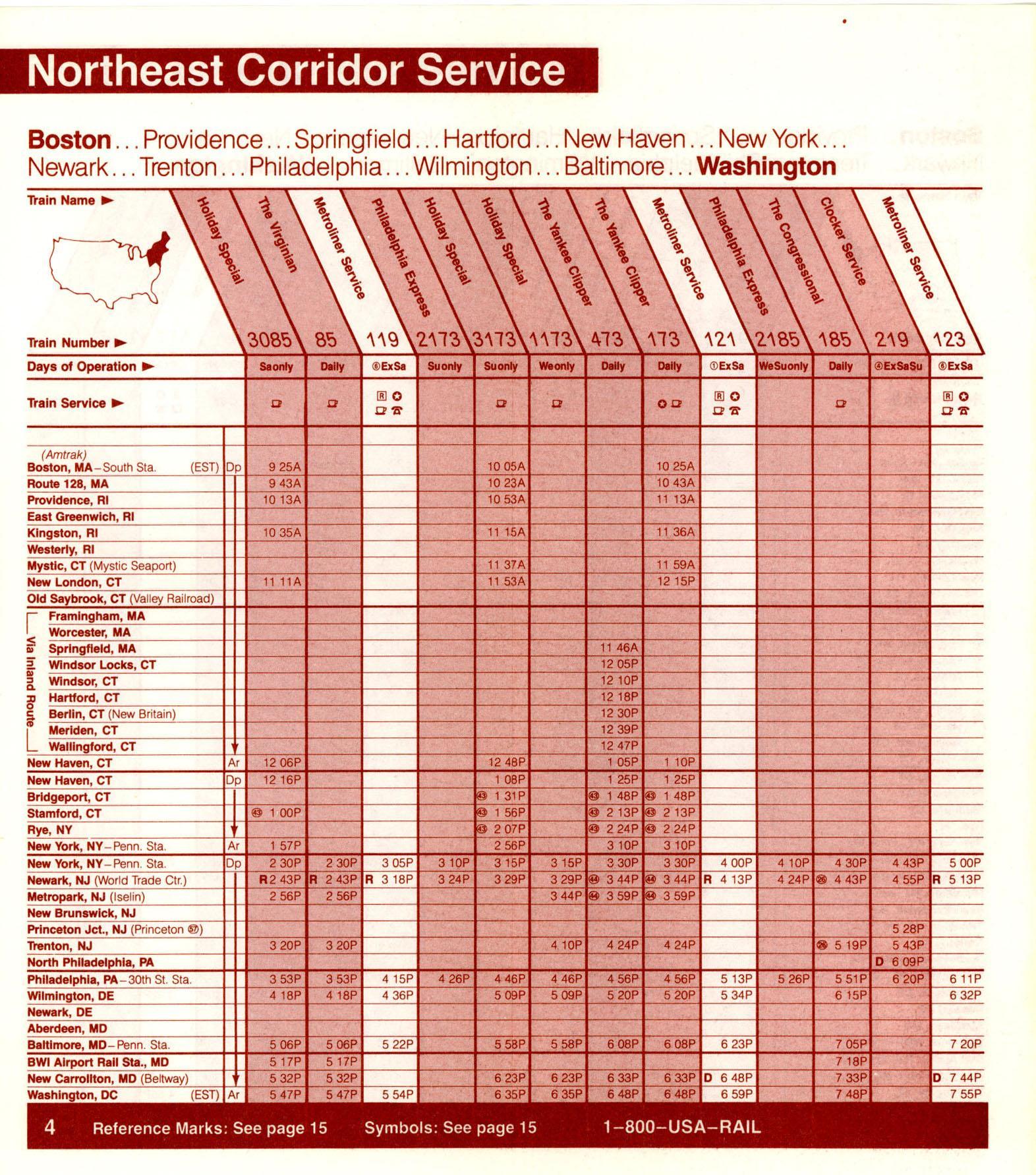 This timetable image is ©1986 National Railroad Passenger Corporation (Amtrak).