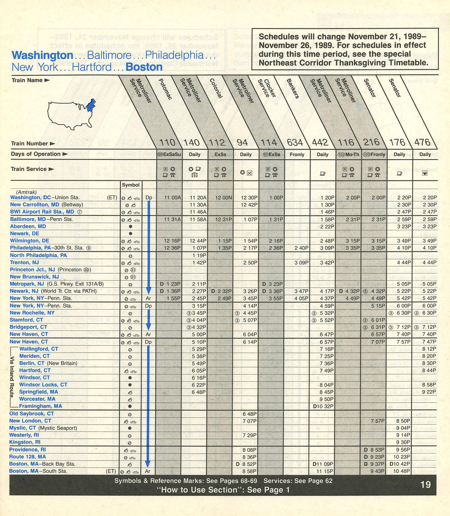 This timetable image is ©1989 National Railroad Passenger Corporation (Amtrak).