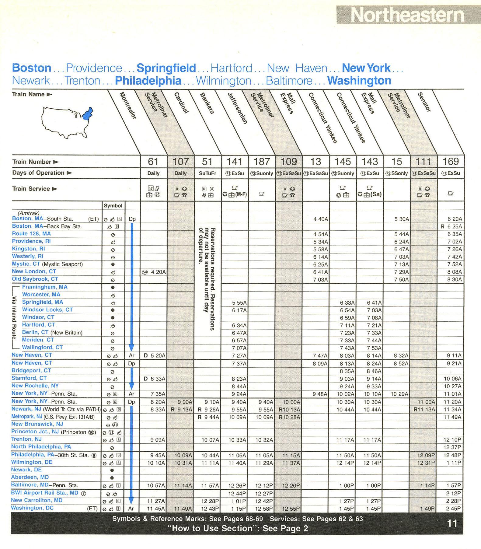 This timetable image is ©1990 National Railroad Passenger Corporation (Amtrak).