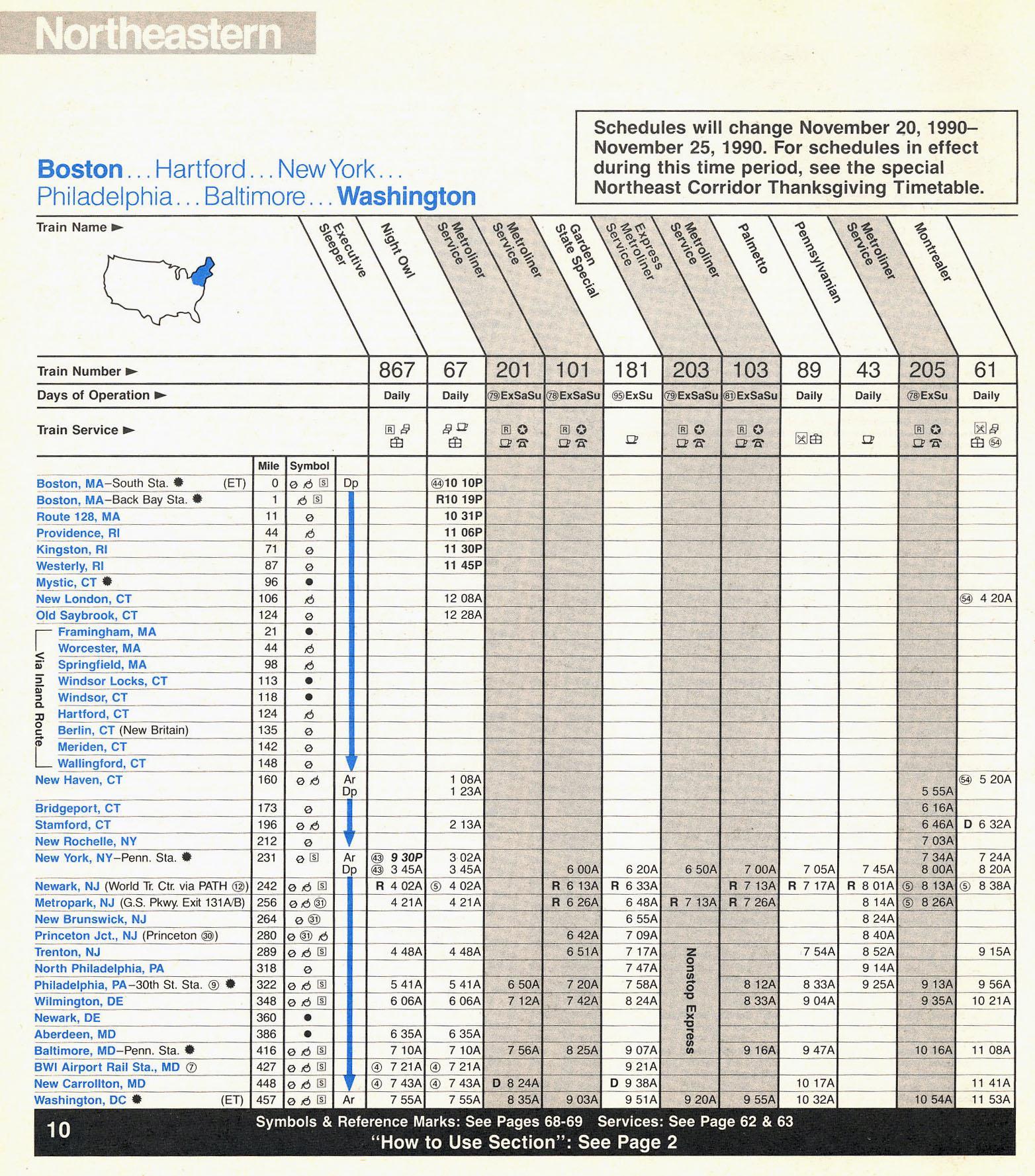 This timetable image is ©1990 National Railroad Passenger Corporation (Amtrak).