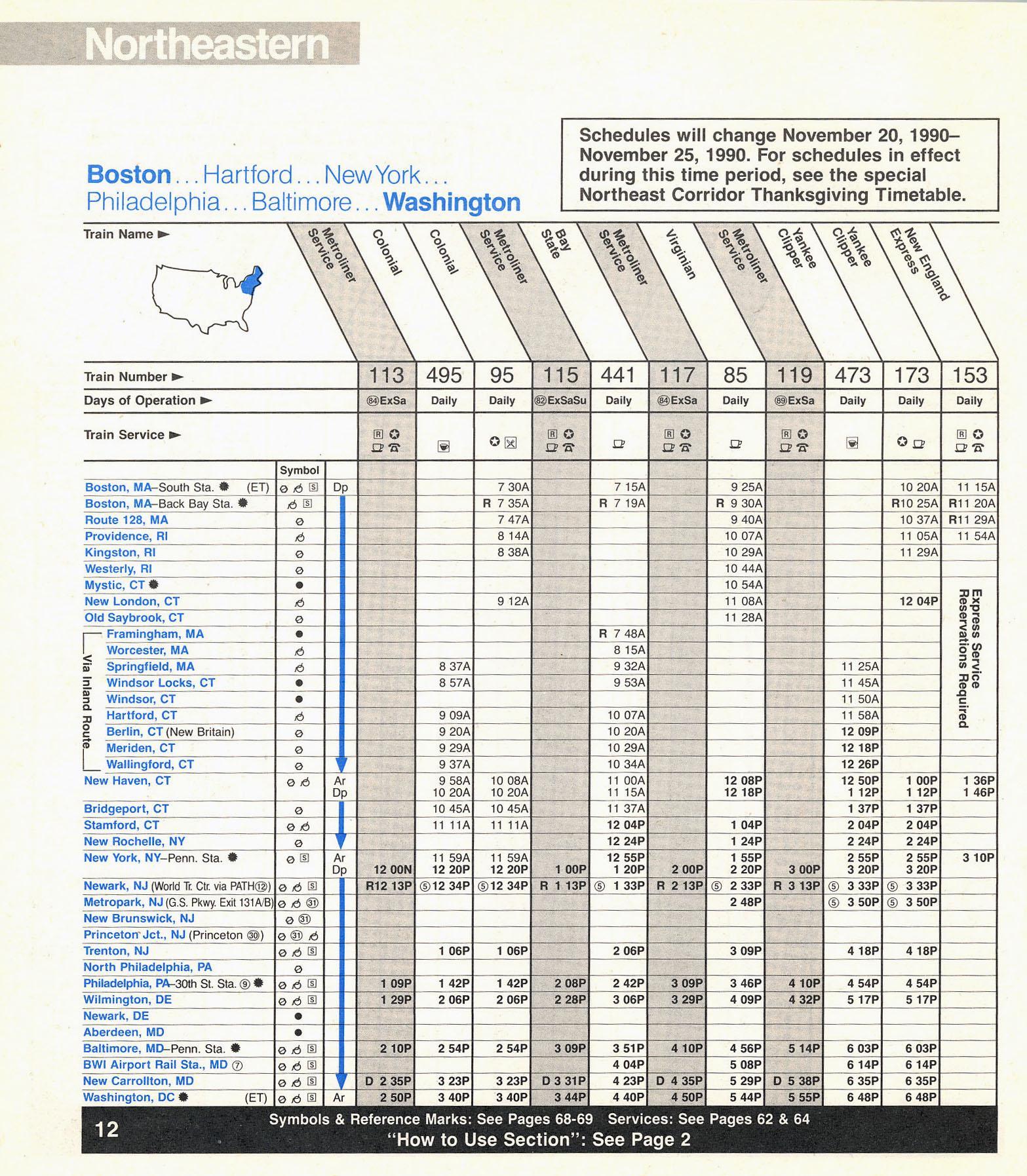 This timetable image is ©1990 National Railroad Passenger Corporation (Amtrak).
