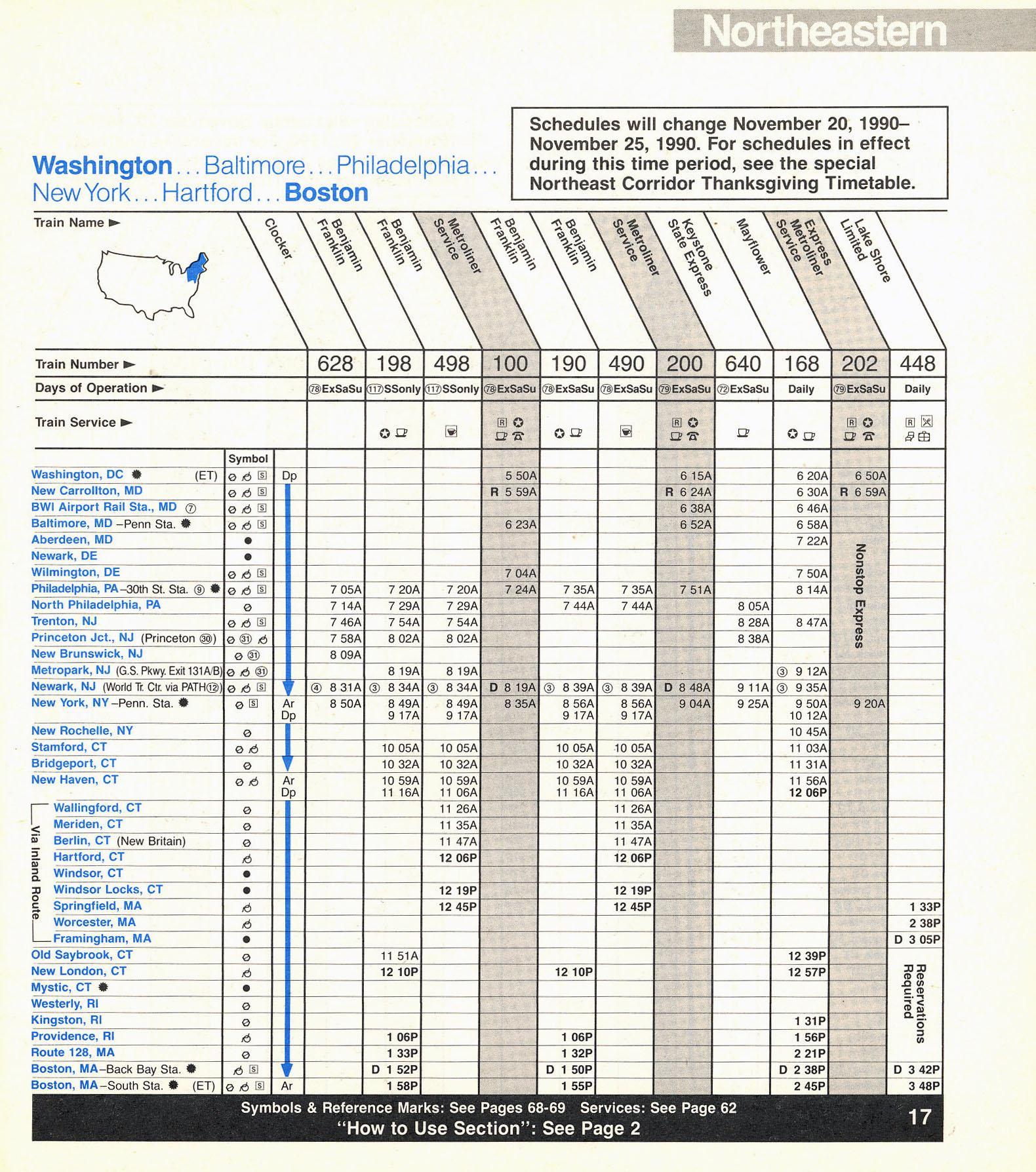 This timetable image is ©1990 National Railroad Passenger Corporation (Amtrak).