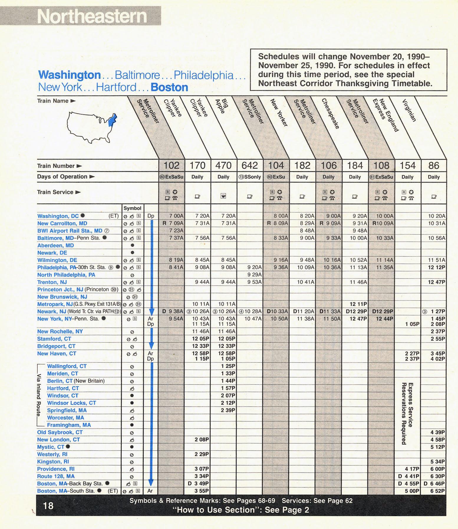 This timetable image is ©1990 National Railroad Passenger Corporation (Amtrak).