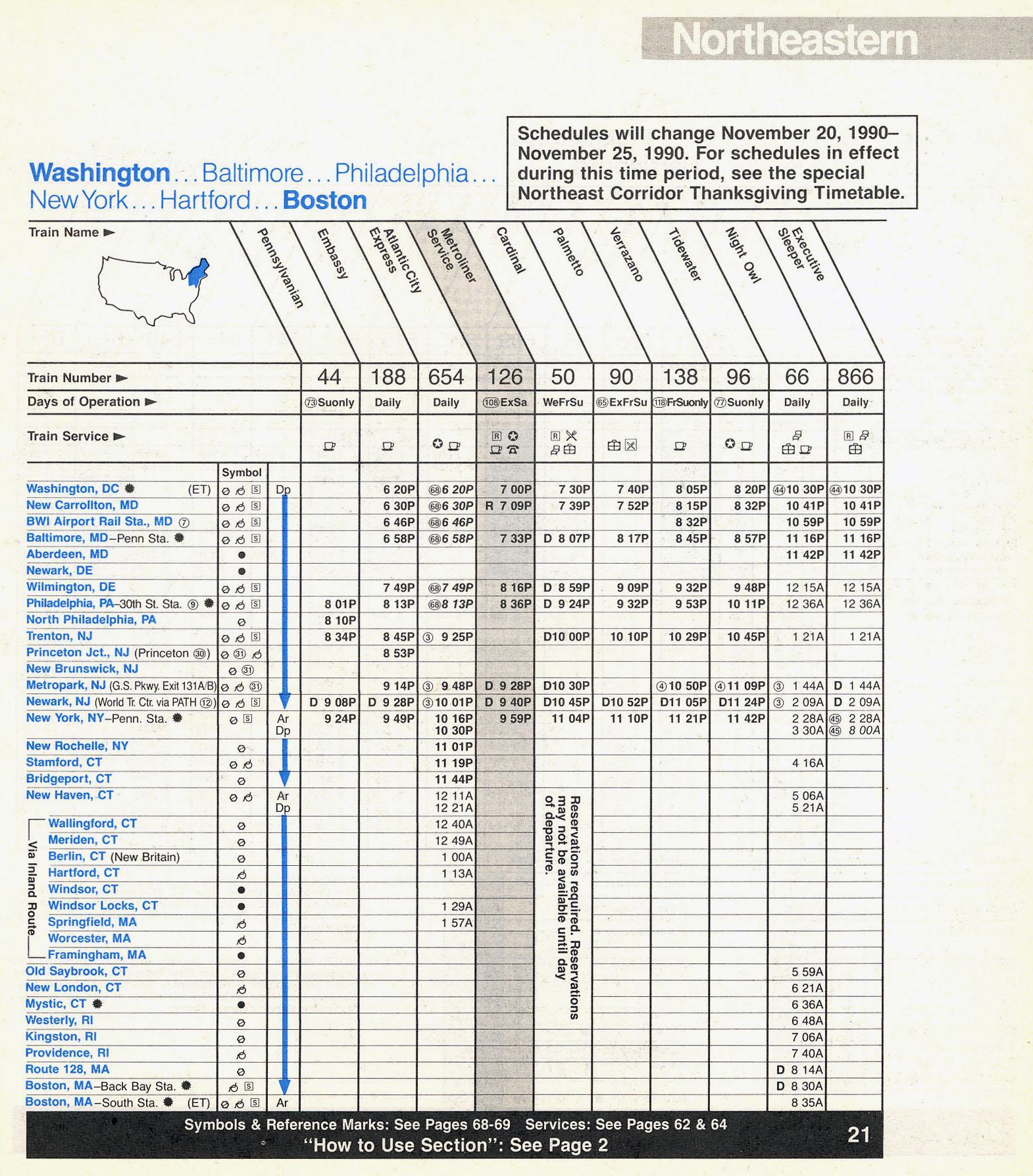 This timetable image is ©1990 National Railroad Passenger Corporation (Amtrak).