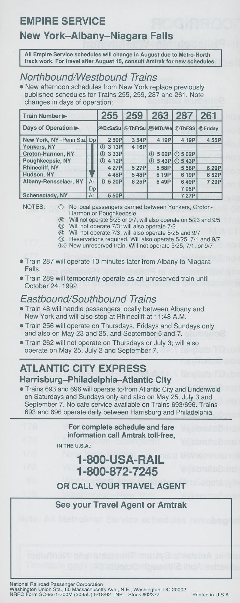 This timetable image is ©1992 National Railroad Passenger Corporation (Amtrak).