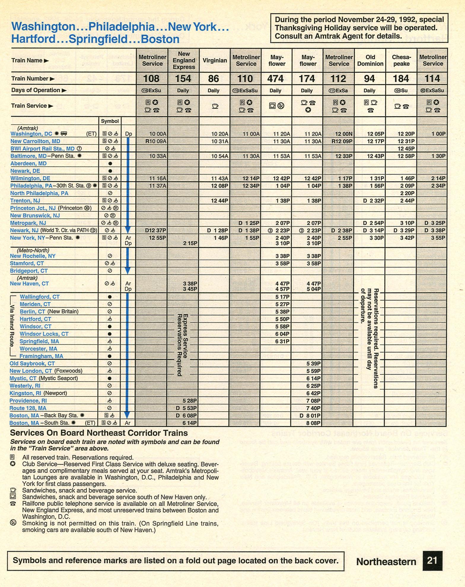 This timetable image is ©1992 National Railroad Passenger Corporation (Amtrak).