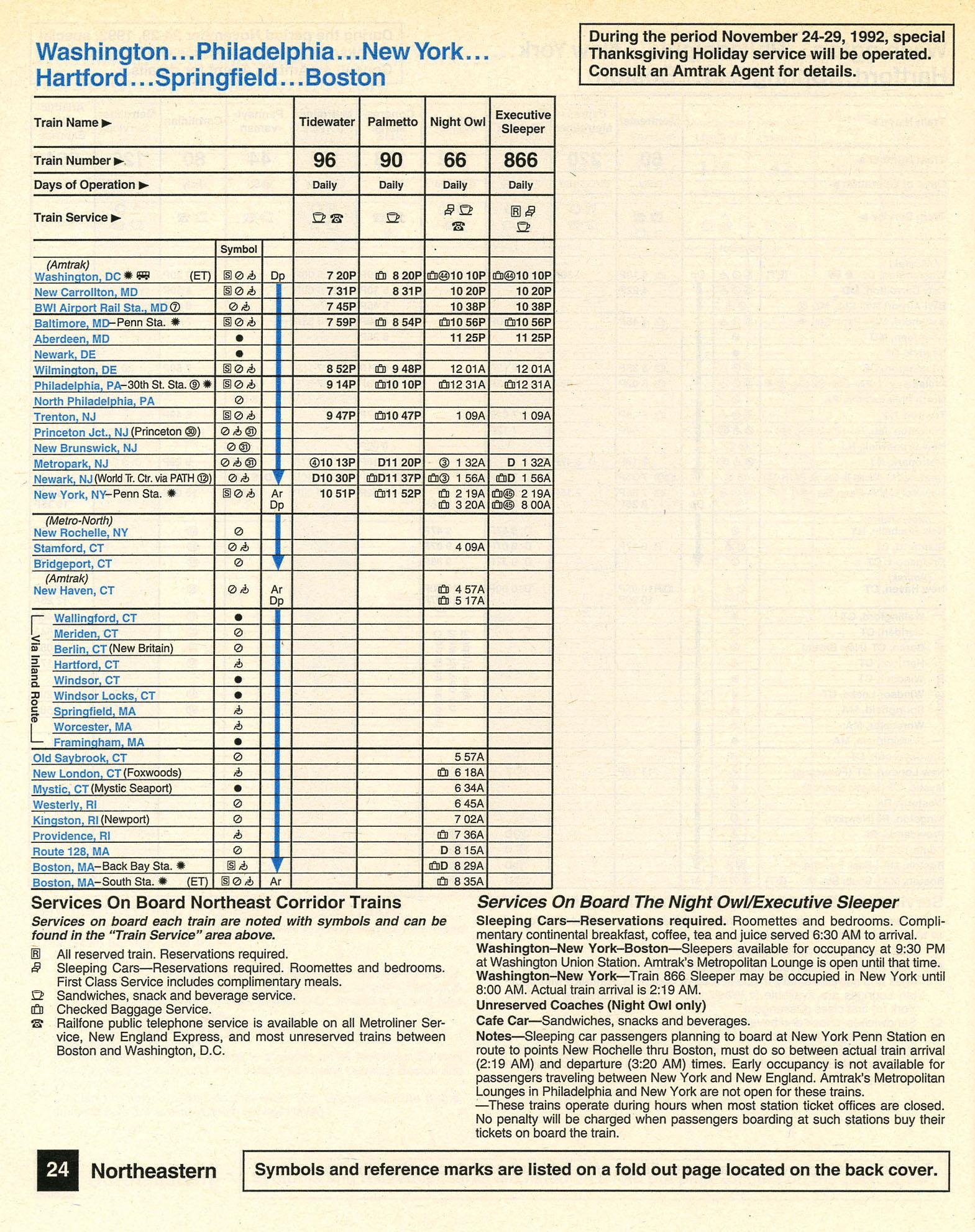 This timetable image is ©1992 National Railroad Passenger Corporation (Amtrak).