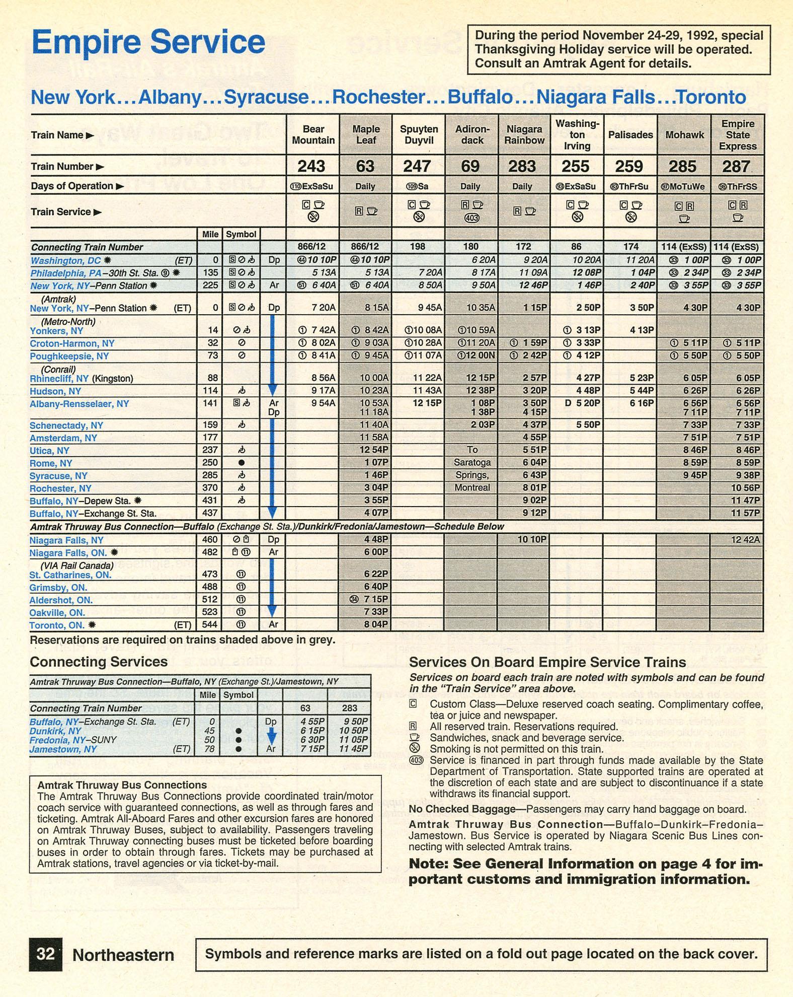 This timetable image is ©1992 National Railroad Passenger Corporation (Amtrak).
