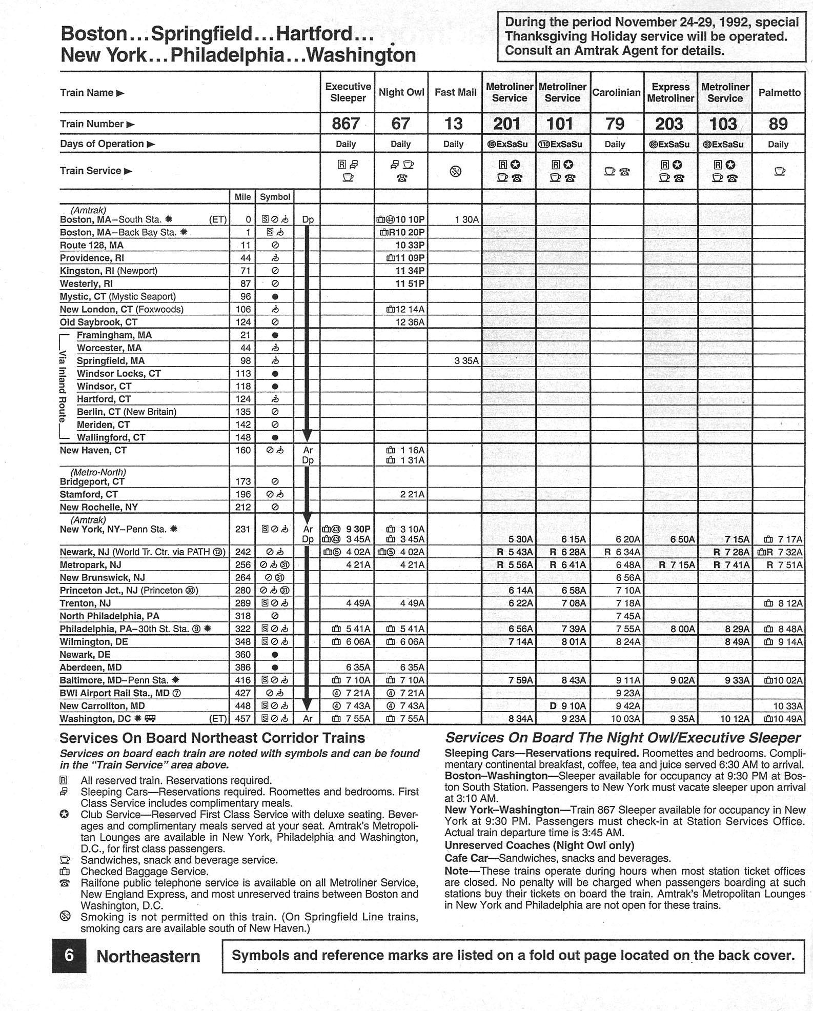 This timetable image is ©1992 National Railroad Passenger Corporation (Amtrak).