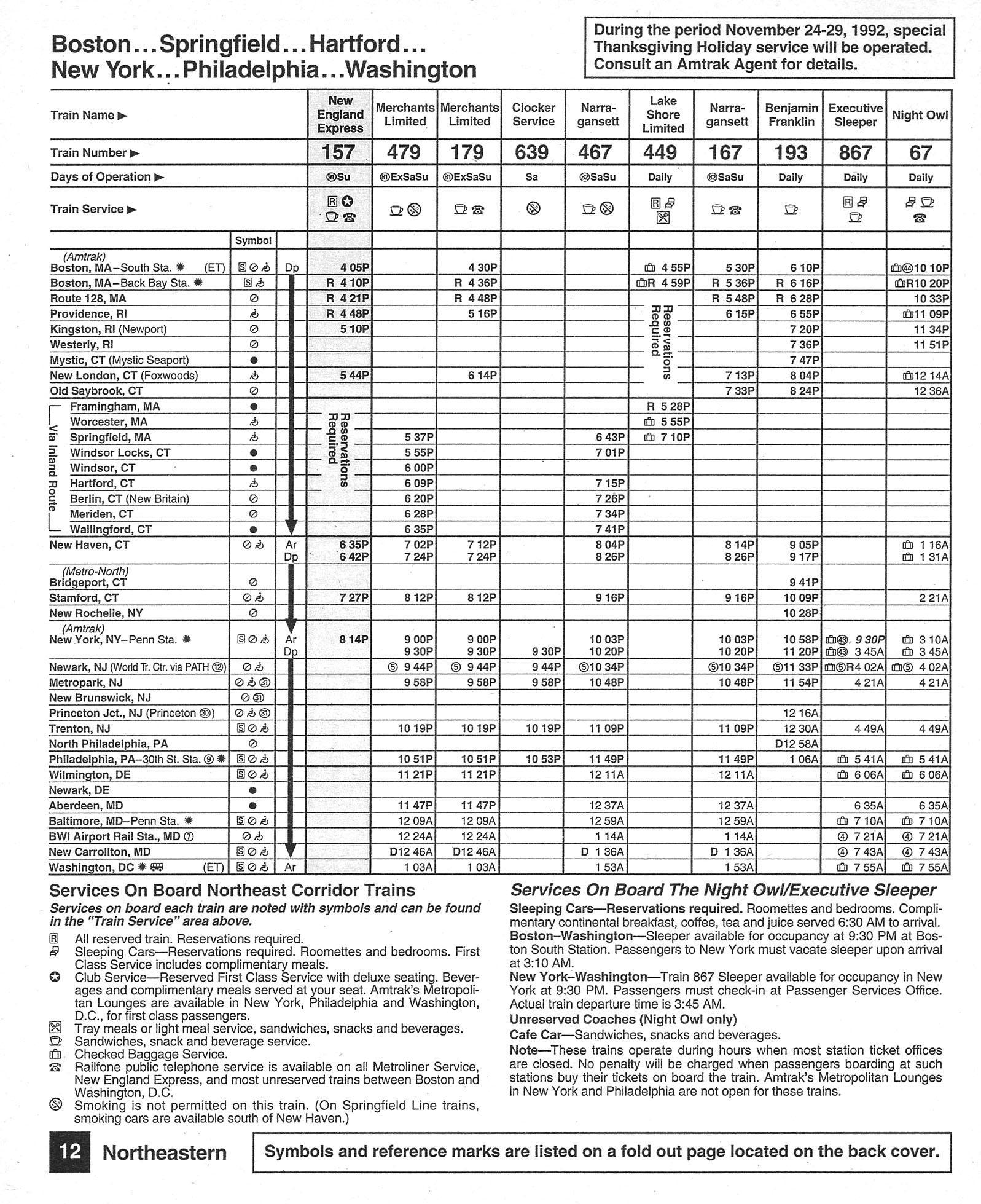 This timetable image is ©1992 National Railroad Passenger Corporation (Amtrak).