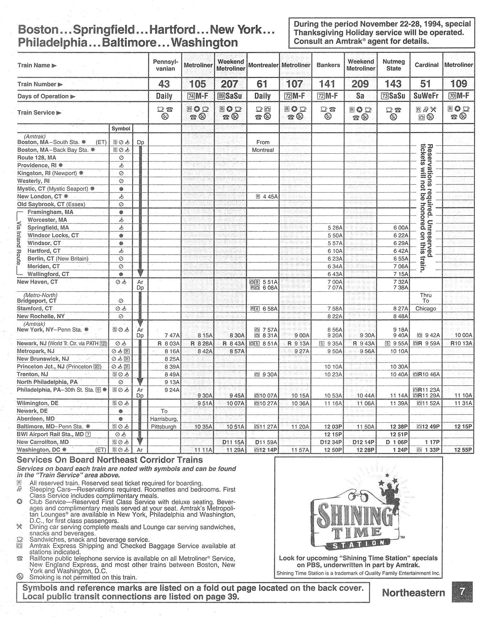 This timetable image is ©1994 National Railroad Passenger Corporation (Amtrak).