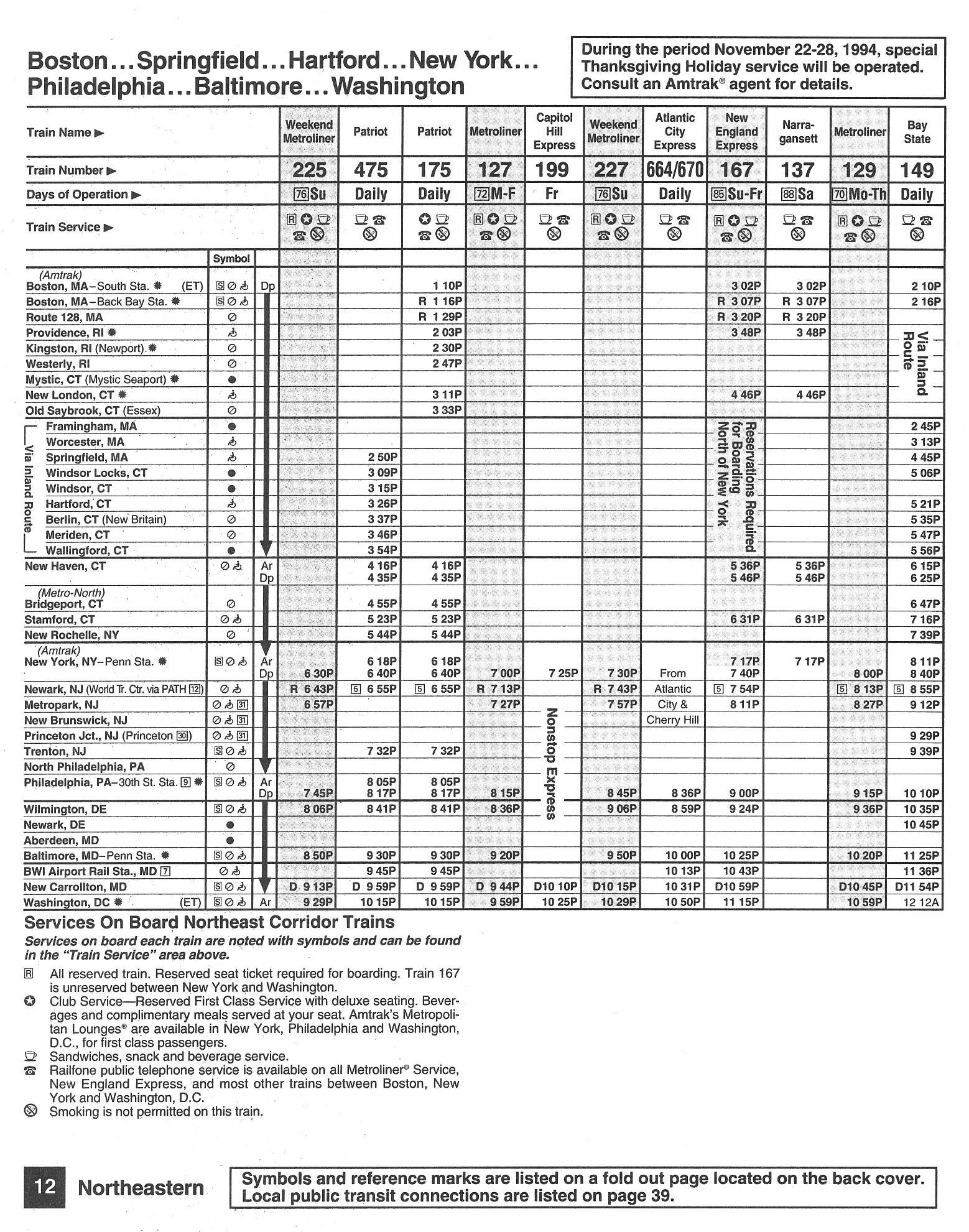 This timetable image is ©1994 National Railroad Passenger Corporation (Amtrak).