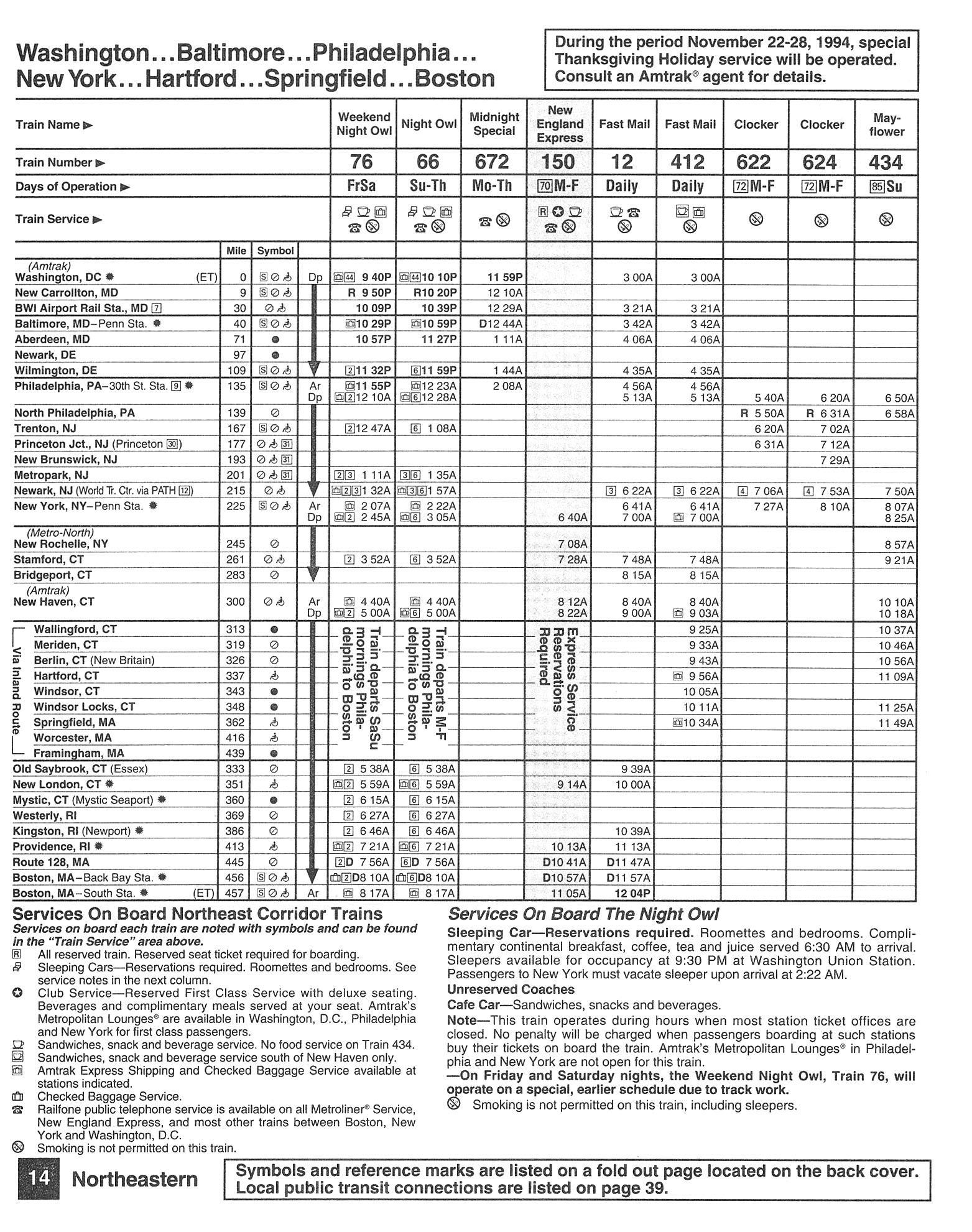 This timetable image is ©1994 National Railroad Passenger Corporation (Amtrak).