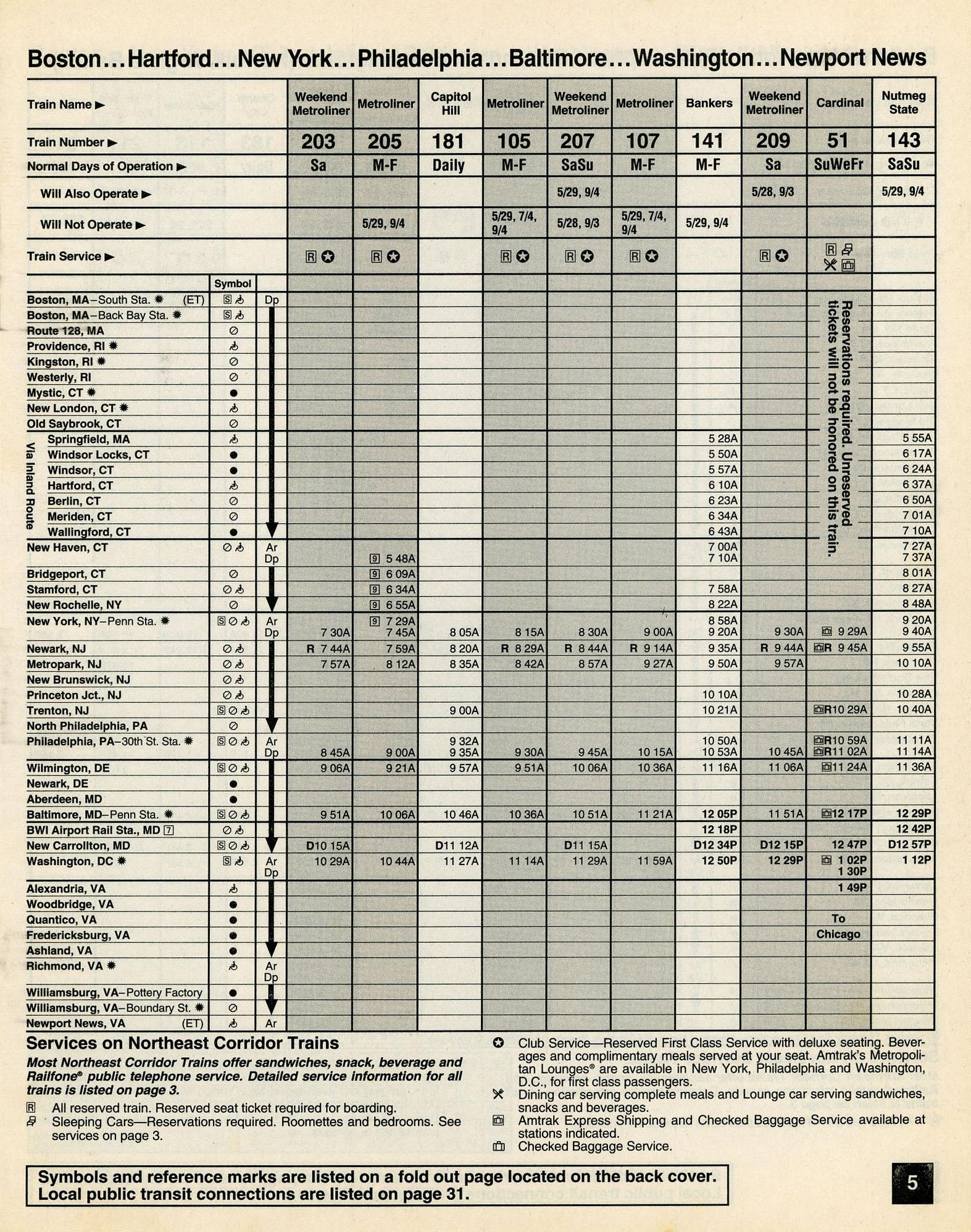 This timetable image is ©1995 National Railroad Passenger Corporation (Amtrak).