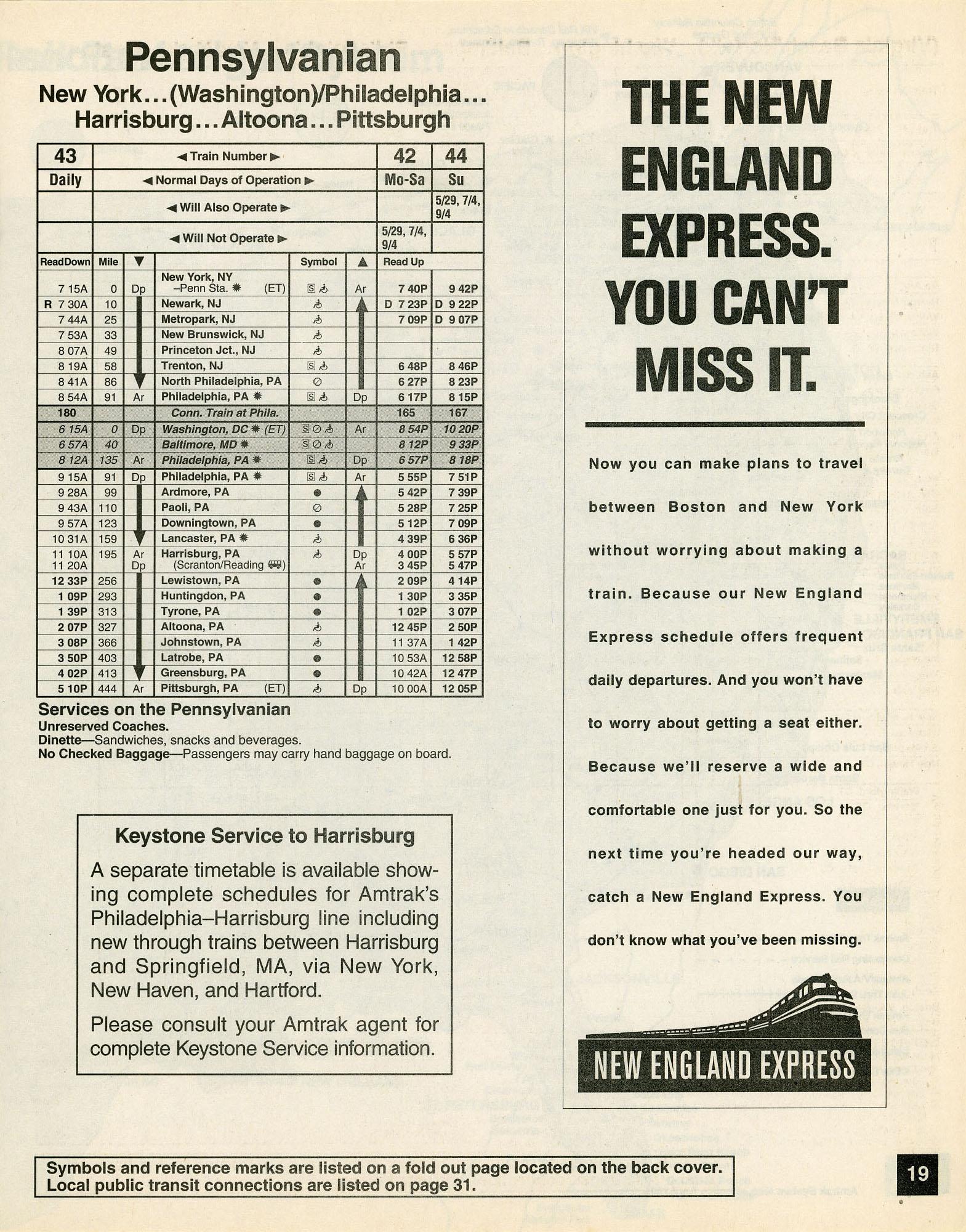 This timetable image is ©1995 National Railroad Passenger Corporation (Amtrak).