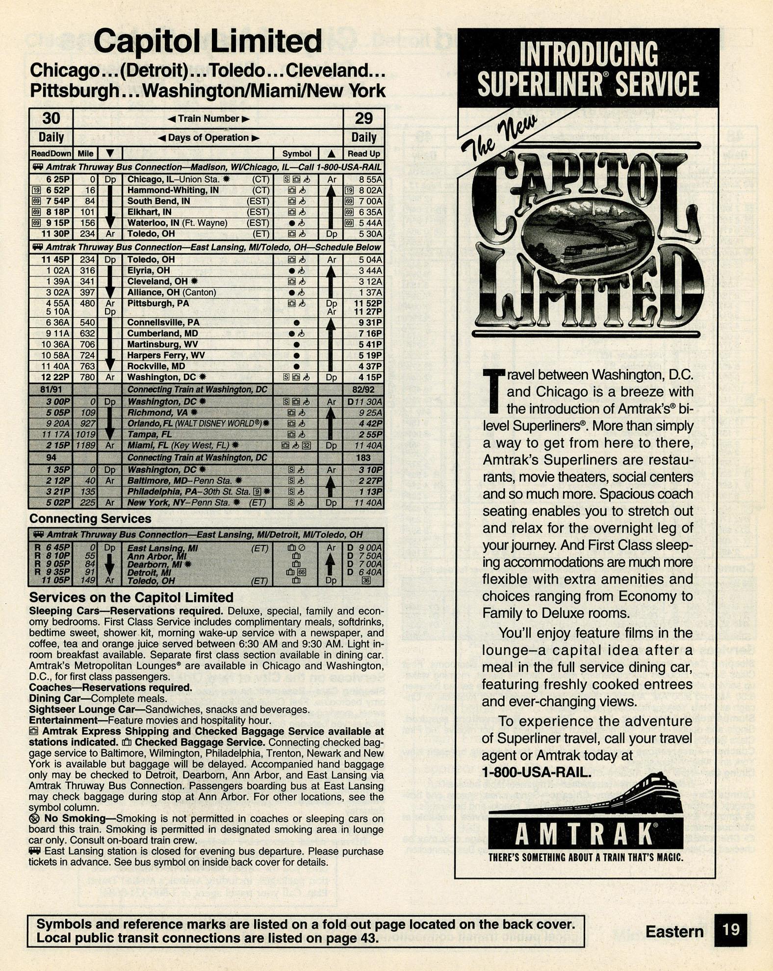 This timetable image is ©1995 National Railroad Passenger Corporation (Amtrak).