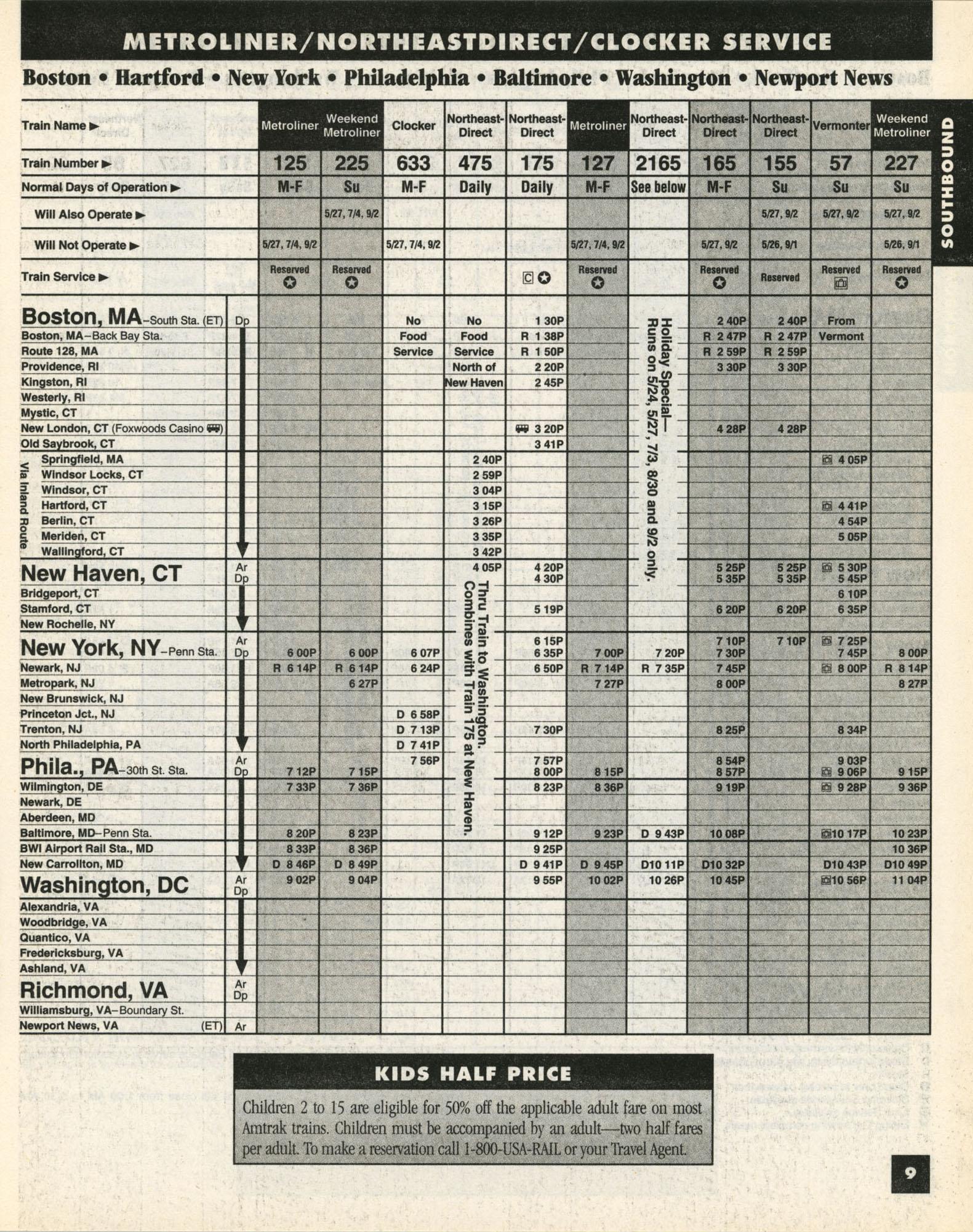 This timetable image is ©1996 National Railroad Passenger Corporation (Amtrak).