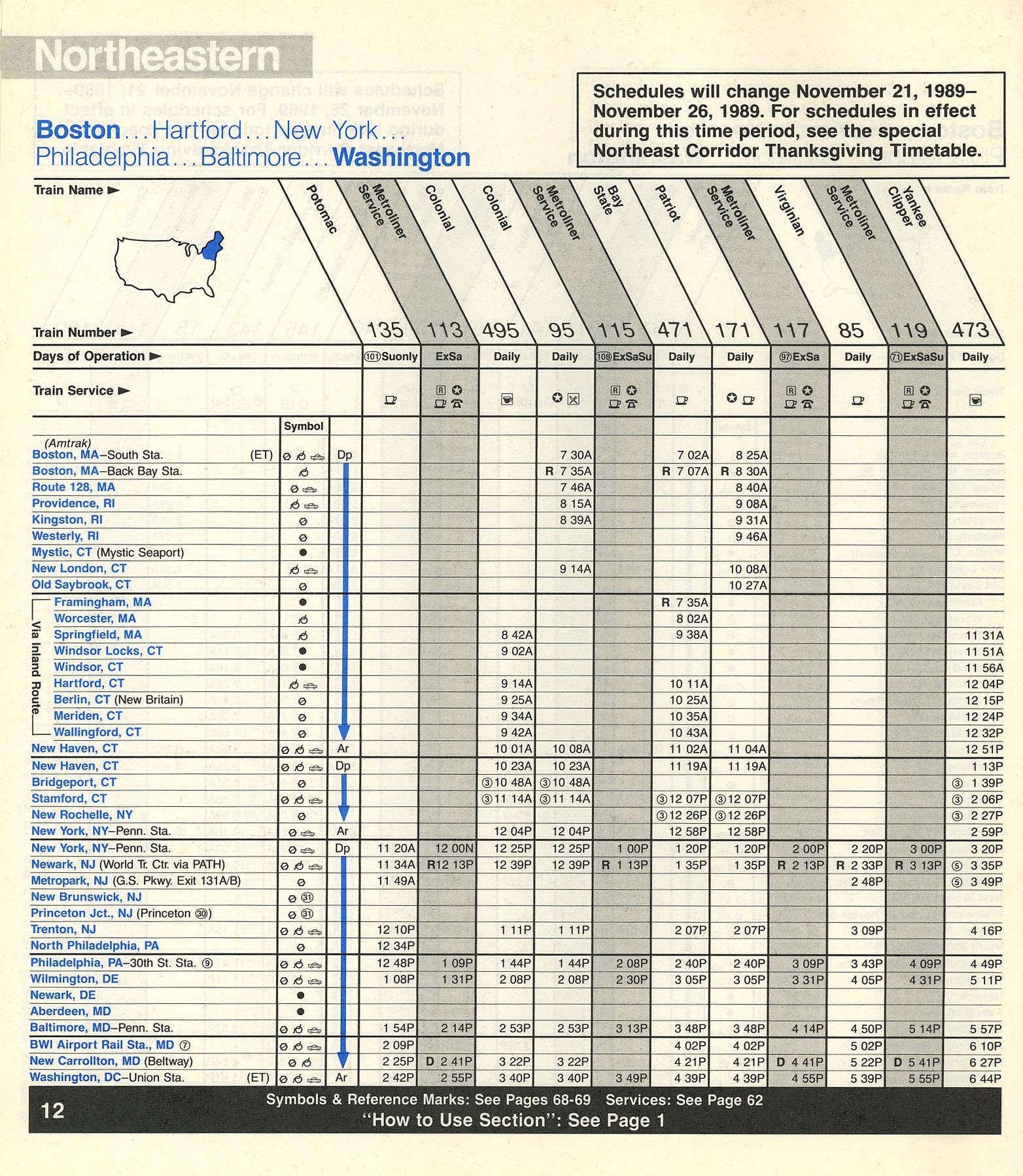 This timetable image is ©1989 National Railroad Passenger Corporation (Amtrak).