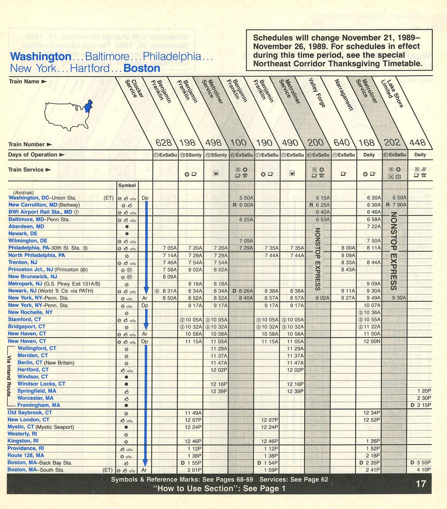 This timetable image is ©1989 National Railroad Passenger Corporation (Amtrak).