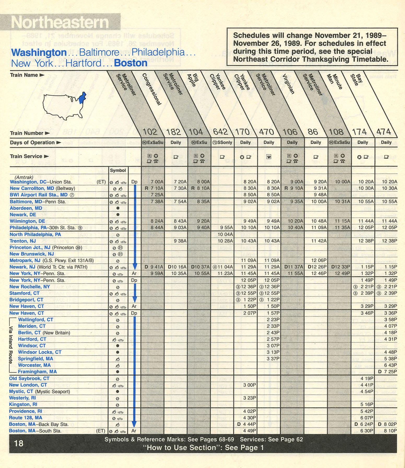 This timetable image is ©1989 National Railroad Passenger Corporation (Amtrak).