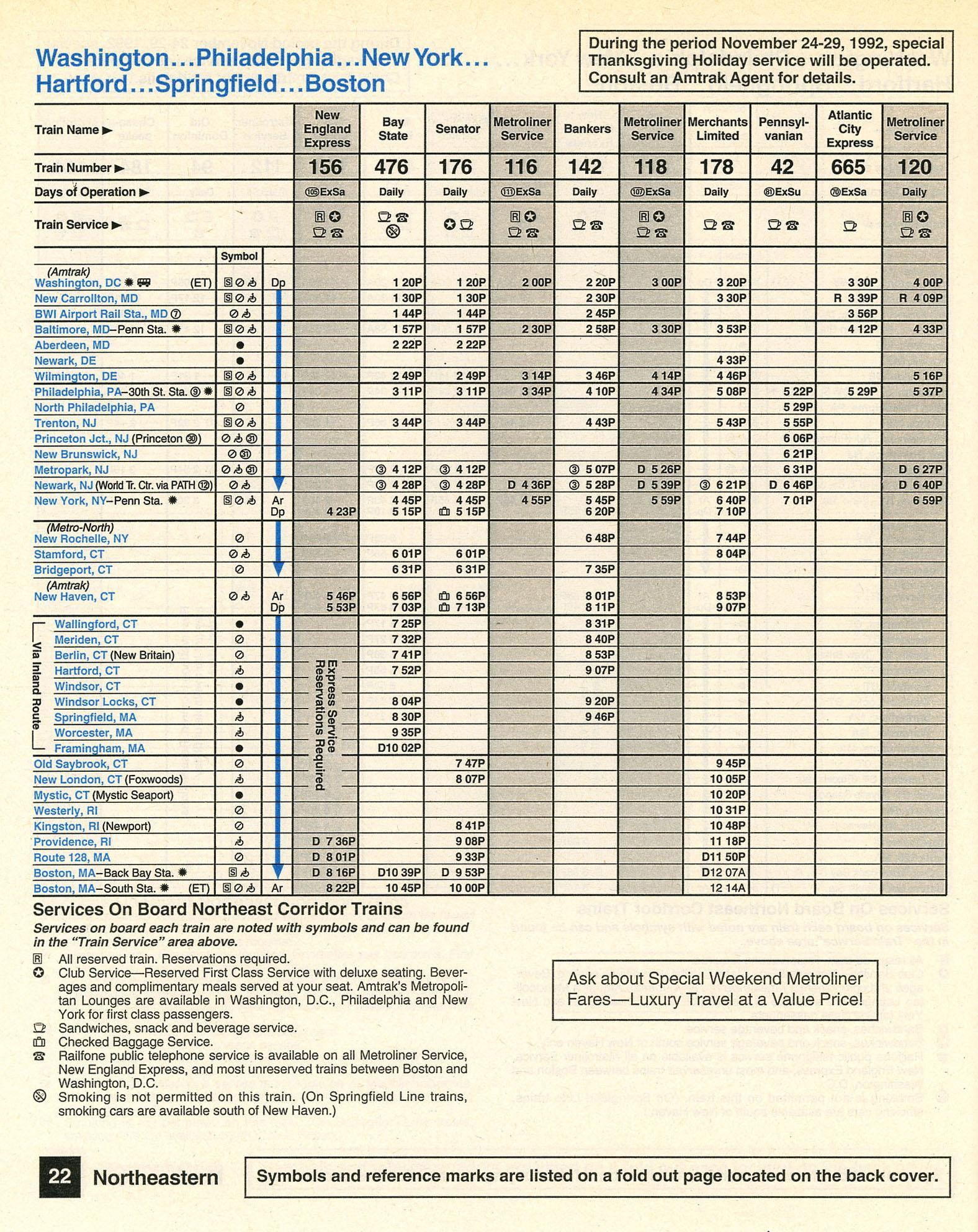 This timetable image is ©1992 National Railroad Passenger Corporation (Amtrak).
