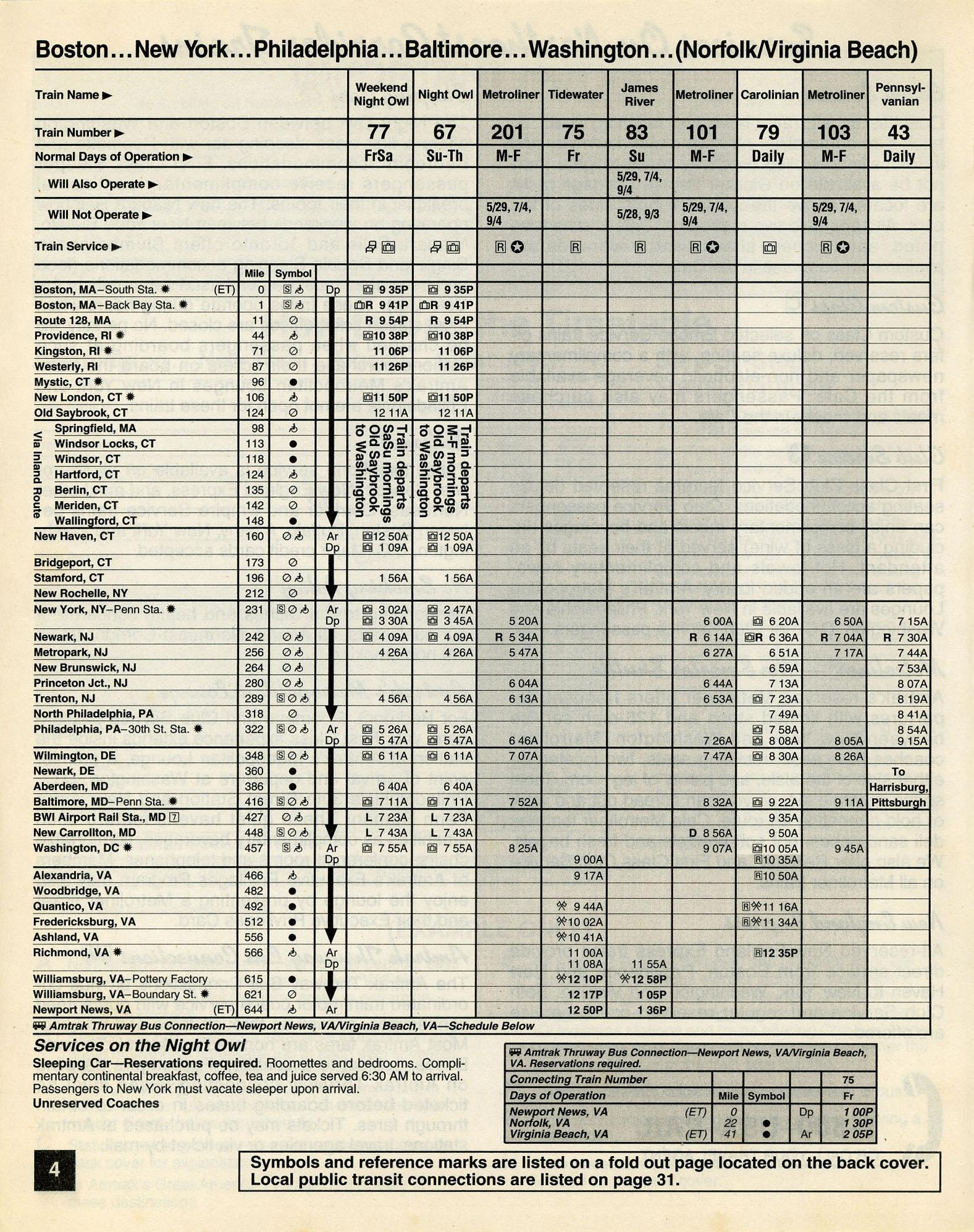 This timetable image is ©1995 National Railroad Passenger Corporation (Amtrak).